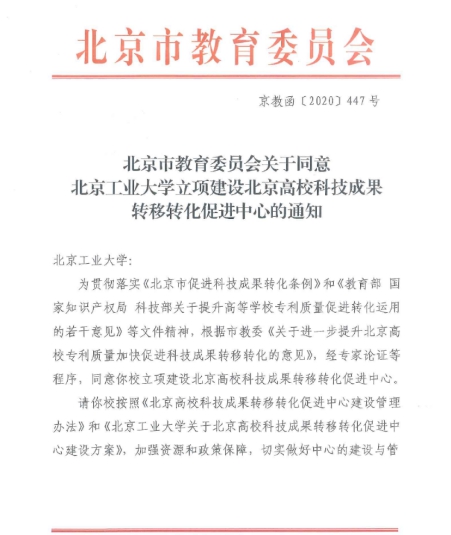 2020年10月16日,根据市教委《关于进一步提升北京高校专利质量加快促进科技成果转移转化的意见》(京教研〔2020〕5号),经专家论证等程序,我校正式获批立项建设“北京高校科技成果转移转化促进中心”,成为首批建设北京高校科技成果转移转化促进中心的三所高校之一。