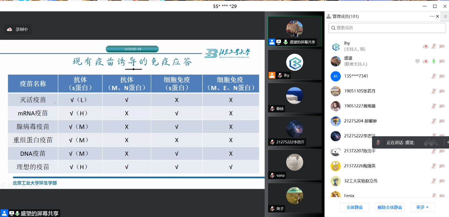 本期主讲专家盛望教授在病毒诊断治疗方面有着丰富的经验,他就新冠病毒结构、新冠病毒生活周期、新冠的传播途径、新冠的防控途径等分阶段、分层次地为大家全面科普了新冠肺炎流行病学知识。 并在线上交流环节,盛望教授就学校师生关心的临床治疗方式,病毒检测效率、核酸检必要性测以及疾病传播风险等一系列问题进行了针对性地解答。盛望教授表示新冠肺炎主要通过飞沫、气溶胶等途径传播。因此,戴口罩、勤洗手、不聚餐、保持人际交往距离等是有效的预防并且“核”网恢恢,疏而不漏,各位师生在做好自身防疫情况下,遵循现阶段防疫政策积极配合核酸检测,为自己和他人增添一份保障。