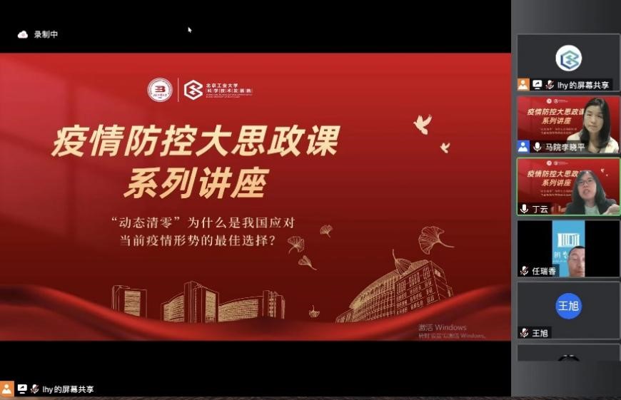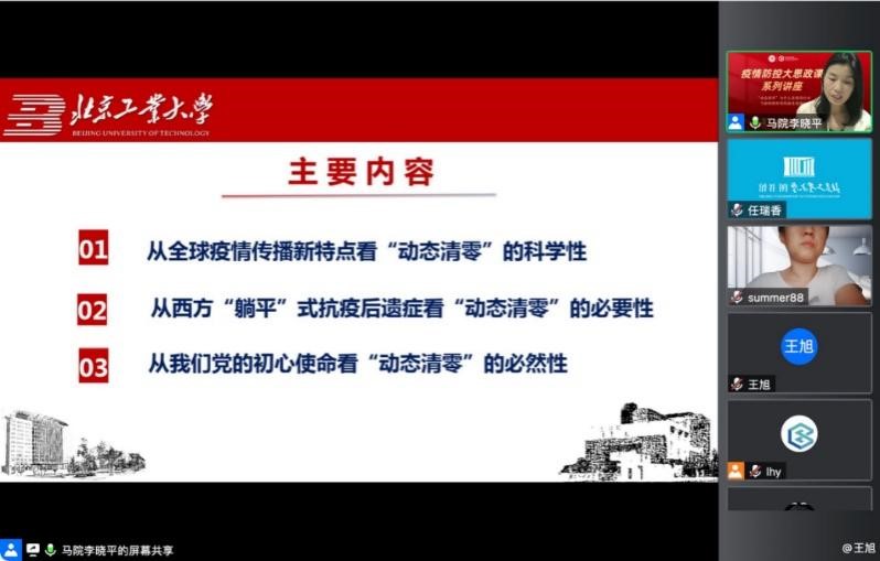 为了贯彻习近平总书记关于“善用大思政课”的理念,配合我校“共同战疫·攻坚有我”主题教育的开展,发挥思政课教师在防疫抗疫中的思想引导作用,彰显中国防疫抗疫的制度优势,讲好抗疫防疫榜样故事,我校科技抗疫组主办、科学技术发展院与马克思主义学院承办、依托“北京市习近平新时代中国特色社会主义思想研究中心”KY开元集团官网研究基地,开设了“疫情防控大思政课系列讲座”。5月25日晚,第一场讲座在腾讯会议线上顺利举行,主题为“动态清零为什么是我国应对当前疫情形势的最佳选择?”。本次讲座由马克思主义学院的李晓平老师主讲、马克思主义学院院长丁云主持,共计150余名师生在线听课。